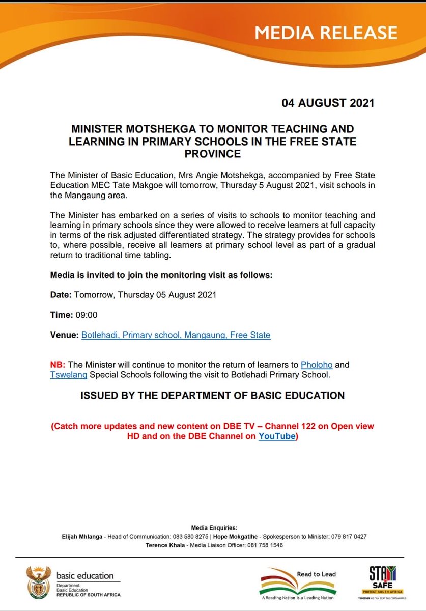 Dep Basic Education On Twitter Minister Angie Motshekga To Visit The Free State To Monitor Teaching And Learning At Primary Schools Mectatemakgoe Elijahmhlanga Reginahmhaule Hubertmweli Https T Co Buxadpvlq8