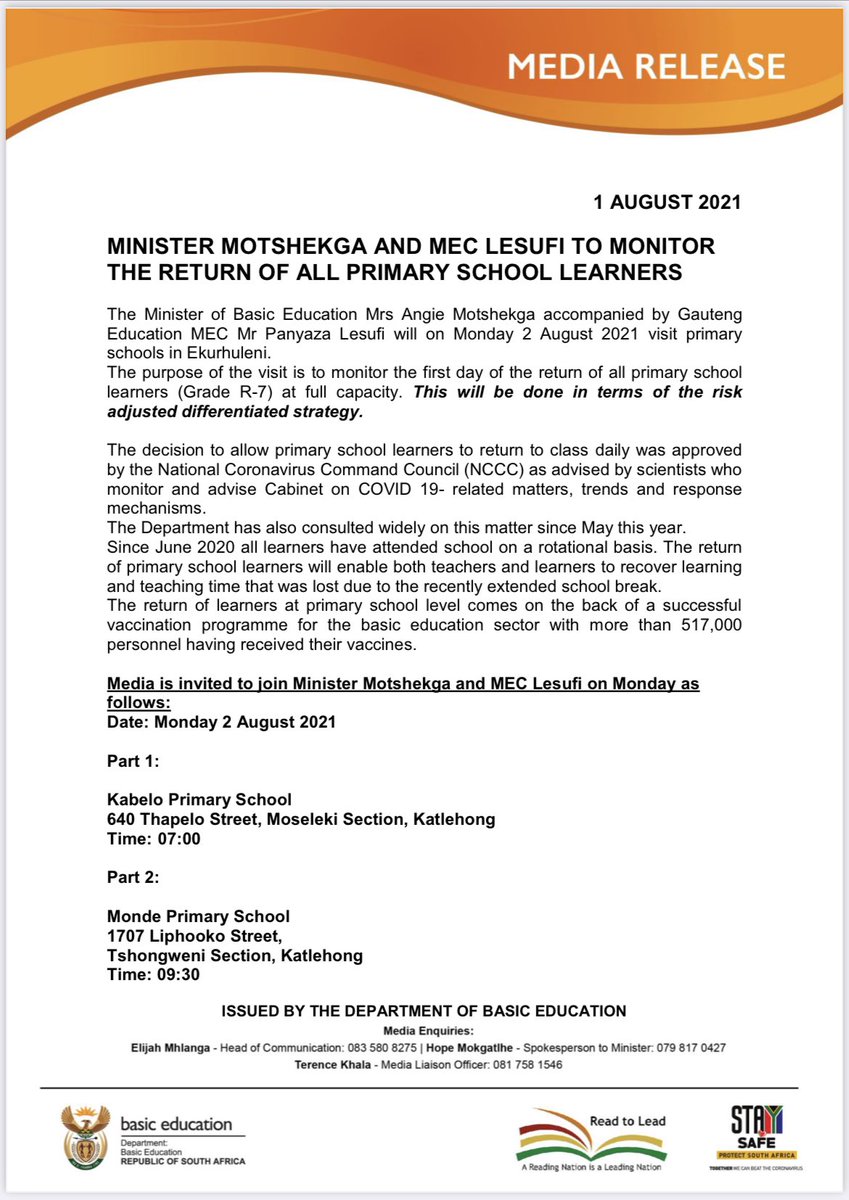 Dep Basic Education On Twitter Minister Angie Motshekga And Educationgp1 Mec Panyaza Lesufi Will Monitor The Return Of All Primary School Learners Tomorrow Https T Co Wgmiamgudr