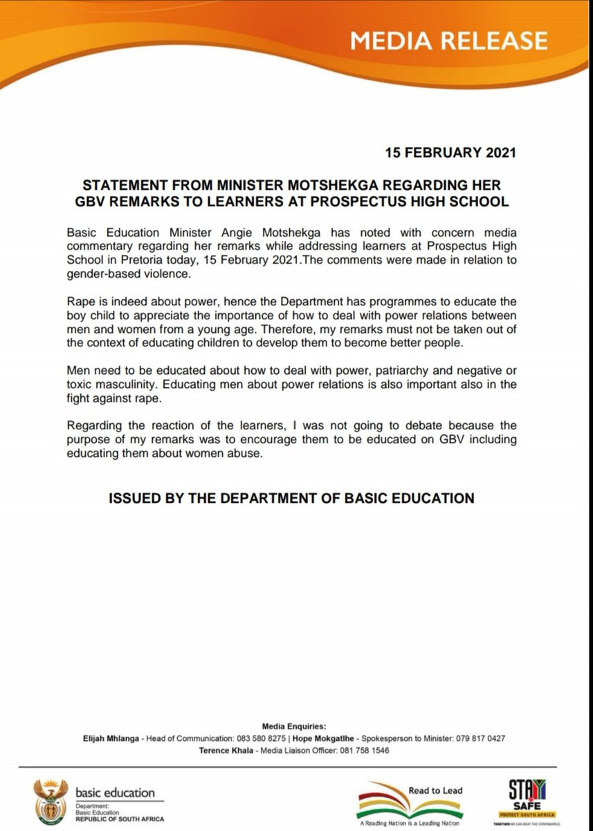 Dep Basic Education On Twitter Statement From Minister Angie Motshekga